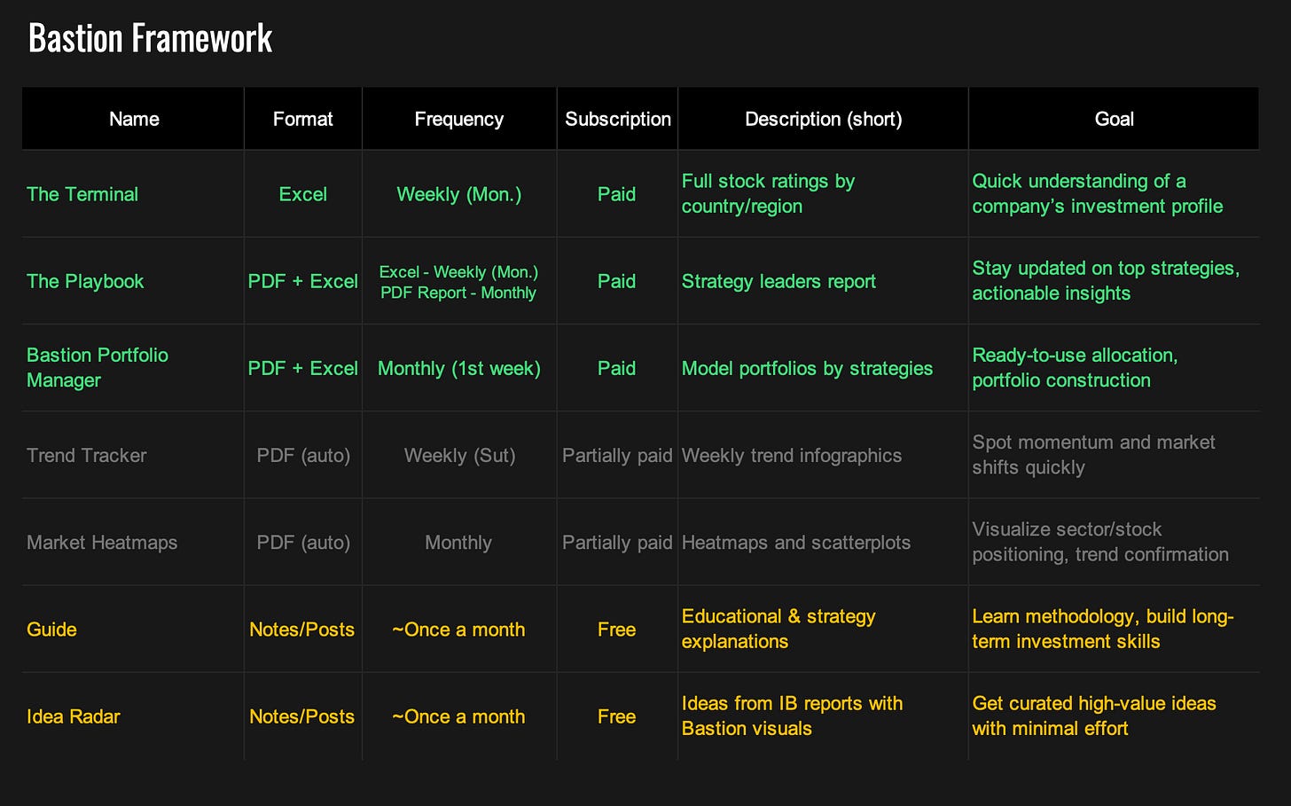 Below you can see the Bastion Framework with all reports and products currently available and in development.