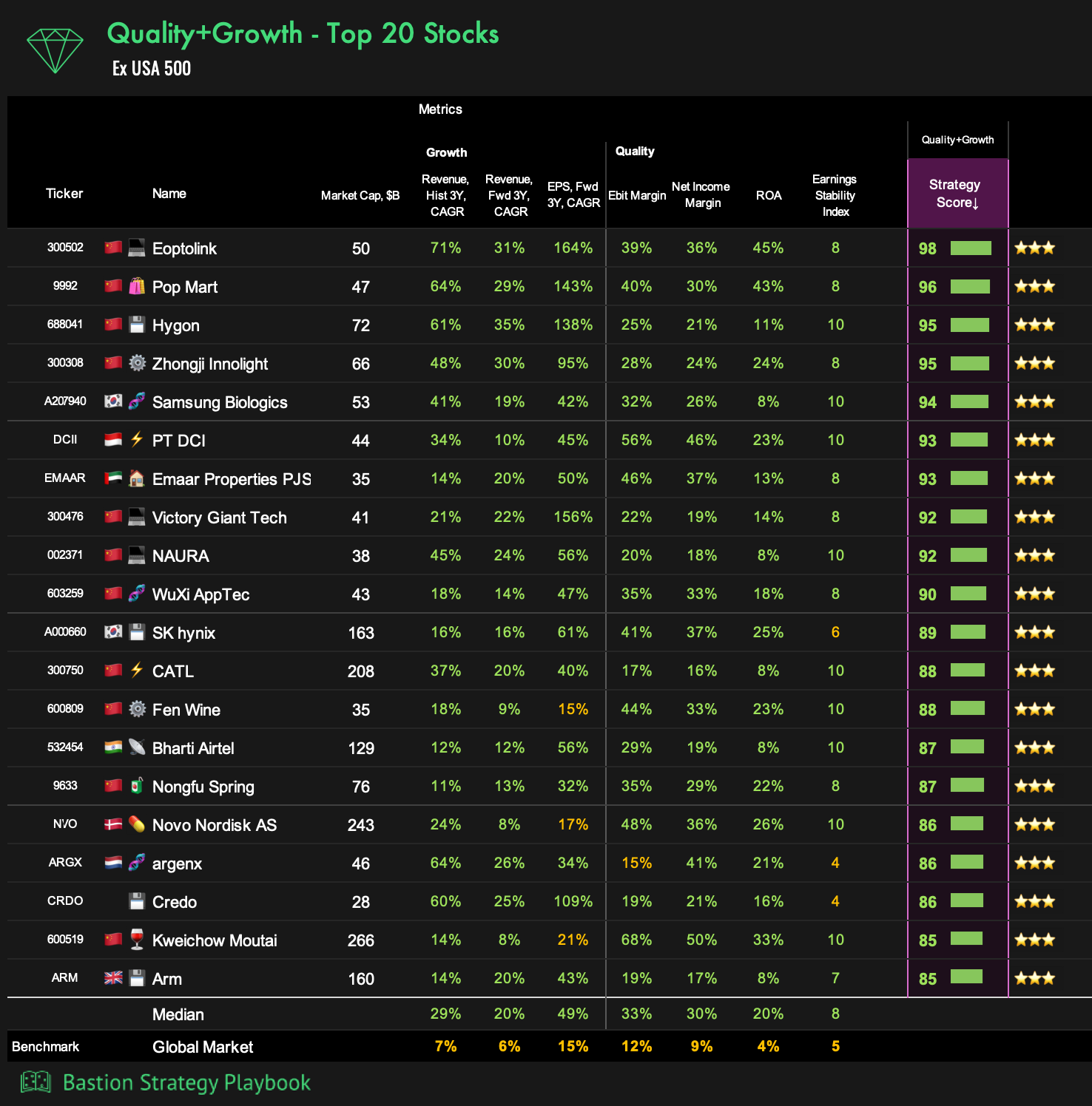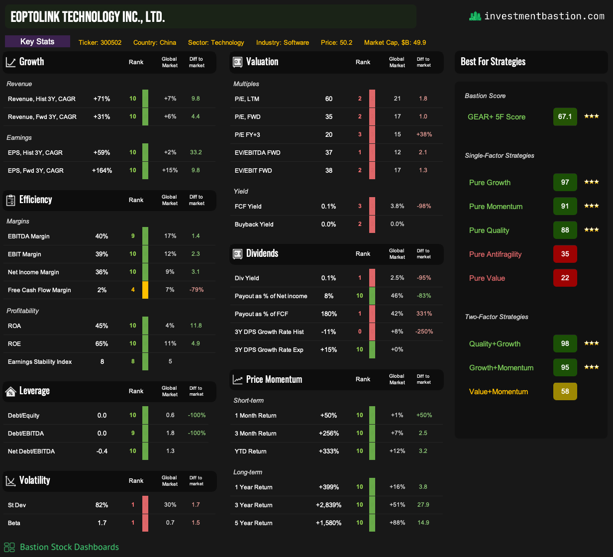 Eoptolink combines elite growth metrics (expected revenue growth of +30% CAGR over the next three years) and quality (net income margin of 36%), while also showing strong stock price momentum. Its 2028 P/E is 20x, with a Score of 3, which can be considered an attractive valuation compared to other growth peers.