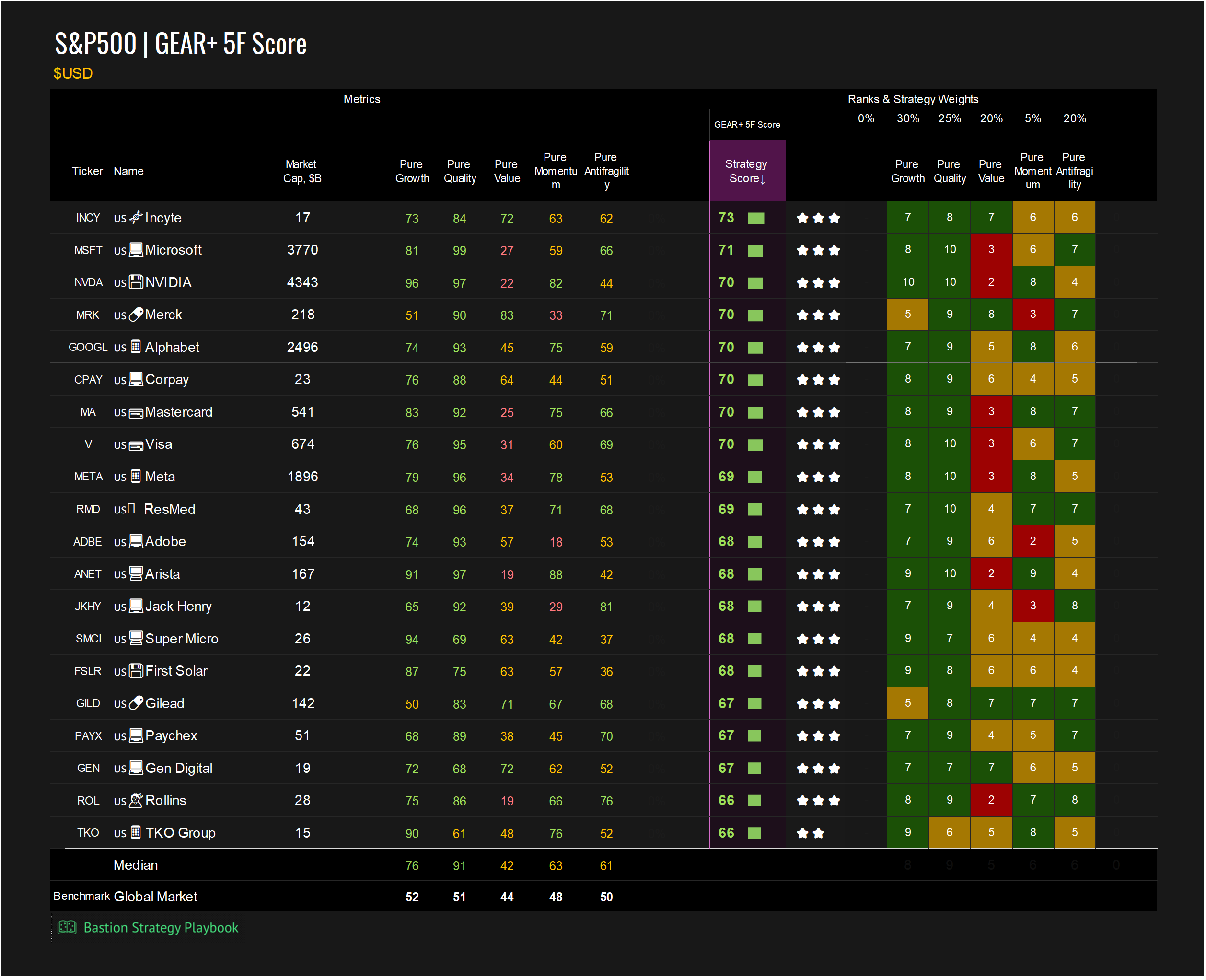 You can explore full stock rankings by strategy in the Excel file ๐ Strategy Playbook in the Bastion Terminal. To view rankings for individual companies, use ๐ Stock Dashboards.